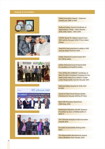 Awards & AccoladesSafety Innovation Award %u2013 Chemical Industry by UBM in 2013APSEZ Award for highest exports from SEZ unit for the year 2016-17 from Adani GroupNational Safety Council Certificate of Appreciation: Taloja %u2013 2014, Mundra %u2013 2016, 2018, Dadra %u2013 2017, 2018 Award for best practices in safety in SEZ area by Adani Ports for 2019Indian Chemical Council Award 2017 for CSR & safetyIndian Chemical Council Award 2018 for excellence of health & safety%u201cICC-EPSILON CARBON%u201d Certificate of Merit for Best Compliant Company for the EMPLOYEE HEALTH & SAFETY CODE under Responsible Care for the year 2021National Safety Awards for 2018, 2021 & 2022Award for Best Social ResponsibilityPractices for the year 2019 by ET NowRashtrapita Mahatma Gandhi Vyasana Purashkar by Govt. of Maharashtra in 2016-17The Clarivate Analytics India InnovationAwards 2019Ecovadis Sustainability Rating Gold %u20132022Best CSR Practices Award from CMO Asia, 2018The Responsible Manufacturer AwardSilver Medallion from Hansei, 202215